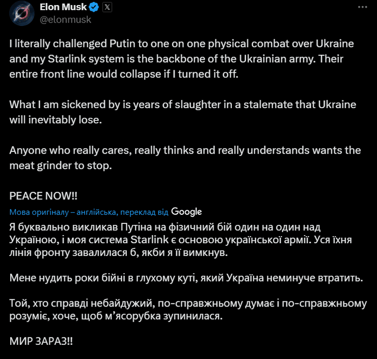 "Я буквально викликав Путіна на двобій за Україну, і моя система Starlink є кістяком української армії. Вся їхня лінія фронту зруйнувалася б, якби я її вимкнув", — написав Маск.