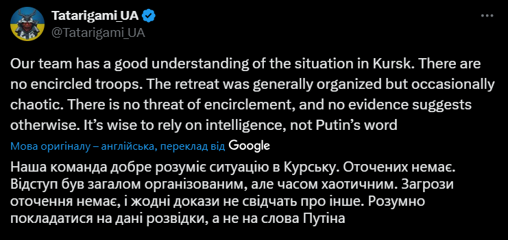 Водночас засновник аналітичної групи Frontelligence Insight, військовий блогер Татаригамі зазначає, що відступ ЗСУ був хаотичним, проте українські сили в Курській області не оточені.