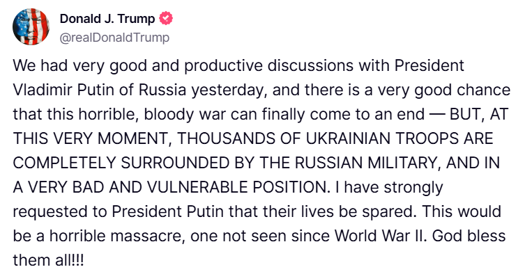 "Тисячі українських солдатів повністю оточені російськими військовими", — написав Трамп, додавши, що просив Путіна зберегти життя українських солдатів.