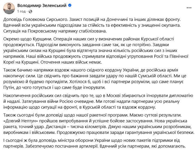 Президент України Володимир Зеленський заявив, що Курська операція виконала своє завдання. За його словами, операція допомогла відтягнути війська окупантів із Покровського, Харківського та Сумського напрямків.