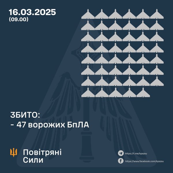 У Повітряних силах ЗСУ повідомили, що у ніч на 16 березня 2025 року росіяни атакували українські міста 90 ударними БпЛА типу Shahed і безпілотниками-імітаторами різних типів.