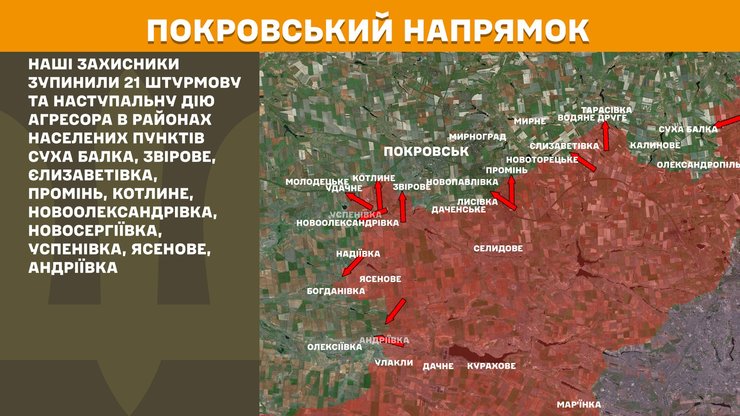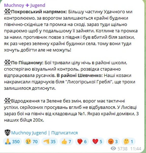 "Покровський напрямок. Більшу частину Удачного ми контролюємо, за ворогом залишаються крайні будинки північно-східніше та промка на сході, зараз туди щільно працюємо, щоб у подальшому її зайняти. Котлине та промка за нами, противник повзе з півдня і був вибитий біля залізки, як раз через зеленку крайні будинки села, тому вони туди хочуть добігти але не можуть", — проінформував він.