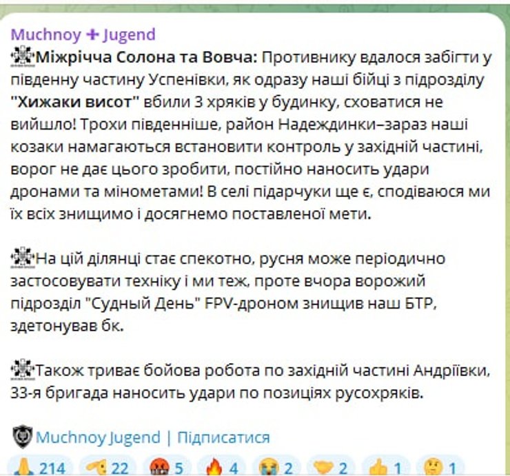 "Міжріччя Солона та Вовча. Противнику вдалося забігти у південну частину Успенівки, як одразу наші бійці з підрозділу "Хижаки висот" вбили 3 хряків у будинку, сховатися не вийшло. Трохи південніше, район Надіївки – зараз наші козаки намагаються встановити контроль у західній частині, ворог не дає цього зробити, постійно завдає удари дронами та мінометами", — розповів військовий.