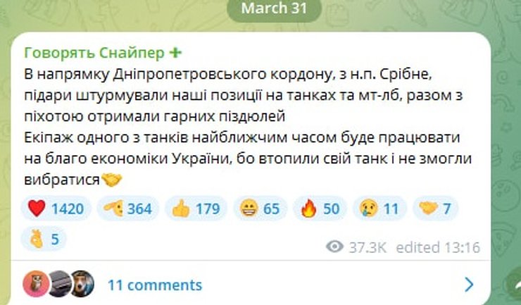 "В напрямку Дніпропетровського кордону, з населеного пункту Срібне, п**ари штурмували наші позиції на танках та МТ-ЛБ, разом з піхотою отримали гарних п**дюлей", — проінформував він.