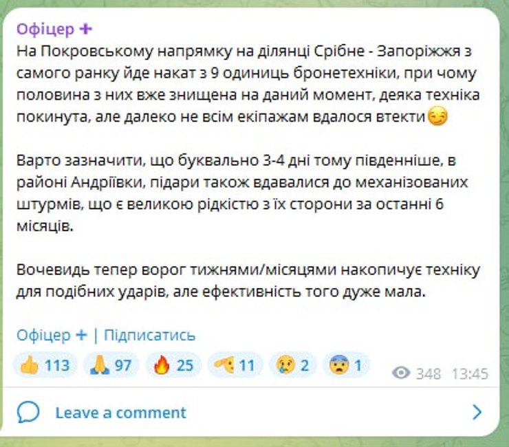 Також інший боєць ЗСУ з позивним "Алекс" розповів, що на Покровському напрямку на ділянці Срібне — Запоріжжя від ранку йде накат з 9 одиниць бронетехніки.