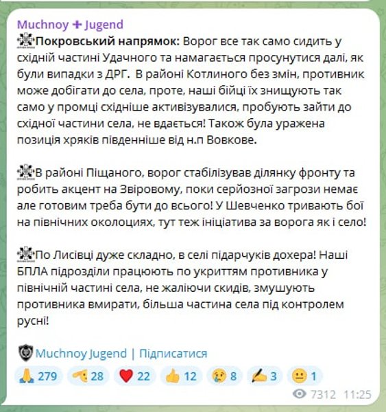 "По Лисівці дуже складно, в селі п**арчуків дох*ра. Наші БпЛА підрозділи працюють по укриттям противника у північній частині села, не жаліючи скидів, змушують противника вмирати, більша частина села під контролем р*сні", — написав "Мучной".