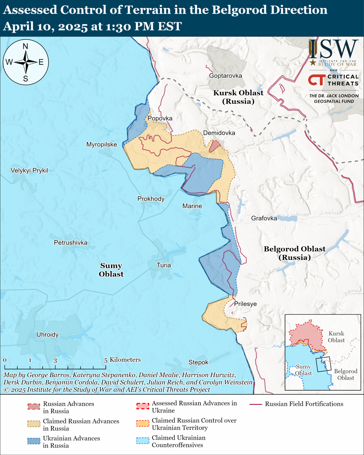 Для того, щоб не допустити ворожий наступ на Суми, ЗСУ утримують залишки плацдарму в районі сіл Олешня та Горналь в Курській області РФ і розпочали 18 березня наступальні дії на Бєлгородщину, де вдалося прорвати російську оборону та закріпитися в районі населених пунктів Демидівка та Попівка, пишуть журналісти.