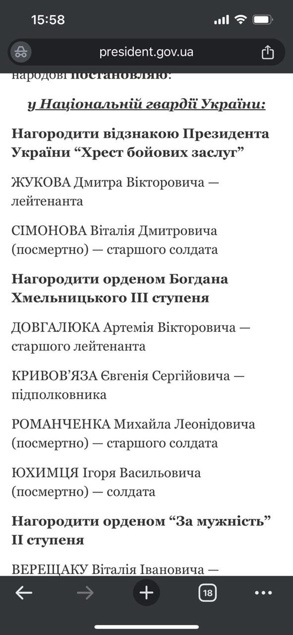 За його словами, поки він ще перебував на службі, його керівництво подало його до нагороди, а 9 квітня 2025 року заступник командира 12 бригади спеціального призначення "Азов" НГУ Святослав Паламар "Калина" навіть привітав його, надіславши скрин цього указу.