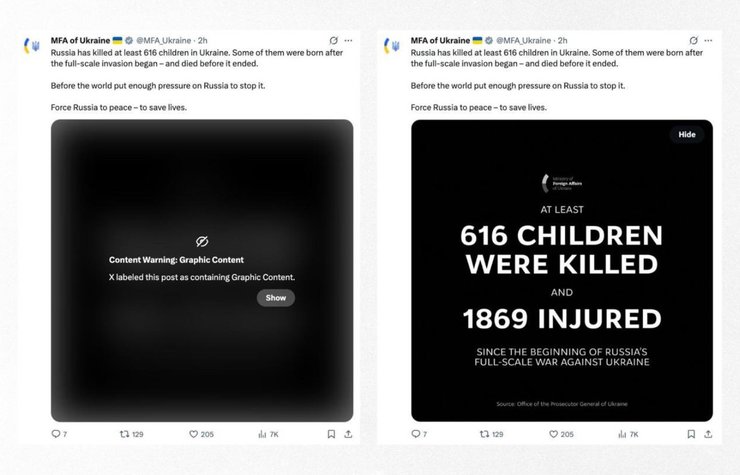 Загалом сама політика X передбачає обмеження доступу до візуального контенту, що містить сцени насильства, жорстокості або інші тривожні зображення. Однак представники України вважають, що в умовах війни такі заходи перетворюються на акт цензури, що грає на руку країні-агресору.