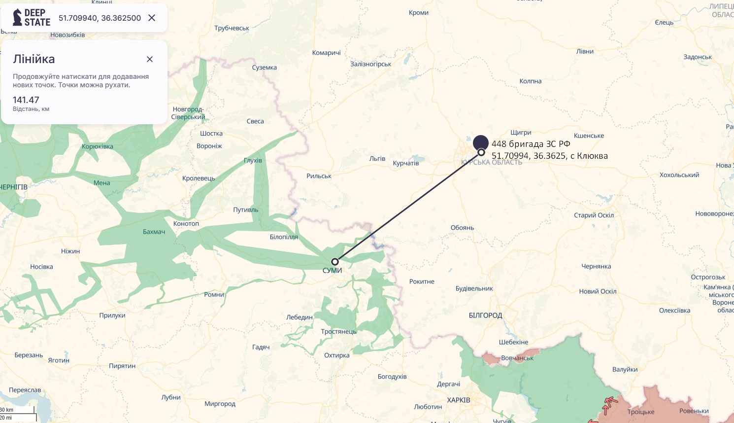 Зазначимо, 15 квітня Генштаб ЗСУ повідомив про удар Сил оборони України по військовій частині 35535 в Курській області. Частина — пункт дислокації 448 ракетної бригади ЗС РФ. В/ч 35535 розміщується поруч з селом Клюква за 140 км від Сум.