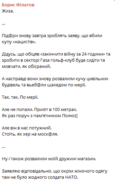 Мер Дніпра Борис Філатов повідомив у своєму Telegram-каналі, що росіяни вдарили "Шахедом" по міській раді, однак промахнулися: за його словами, дрон поцілив за 100 метрів від споруди. Також він зазначив, що ЗС РФ дроном "розвалили" магазин жіночого одягу, який належить його дружині.