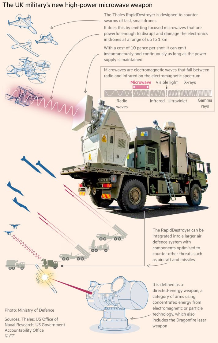 Йдеться про RapidDestroyer – розробку оборонного консорціуму на чолі з французькою корпорацією Thales. Нова модифікація використовує потужну радіочастоту для дистанційного виведення з ладу електроніки в безпілотниках. Такий тип зброї випускає широкий промінь енергії, здатний збивати кілька безпілотників одночасно, – тому це може бути ефективним способом протидії "рою дронів". Проте зауважують, що для захисту інфраструктури така зброя може бути менш ефективною.