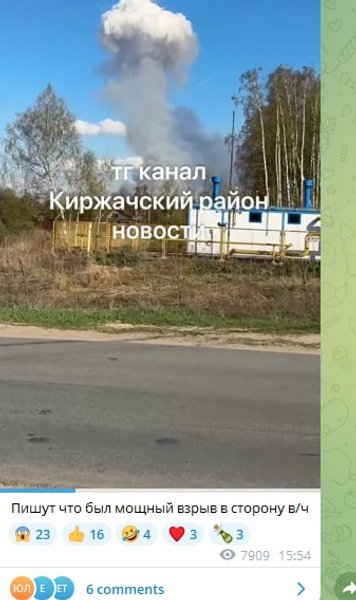 "Був сильний вибух збоку військової частини. З боку Москви в Киржач перекрили дорогу", — повідомляють в пабліку.