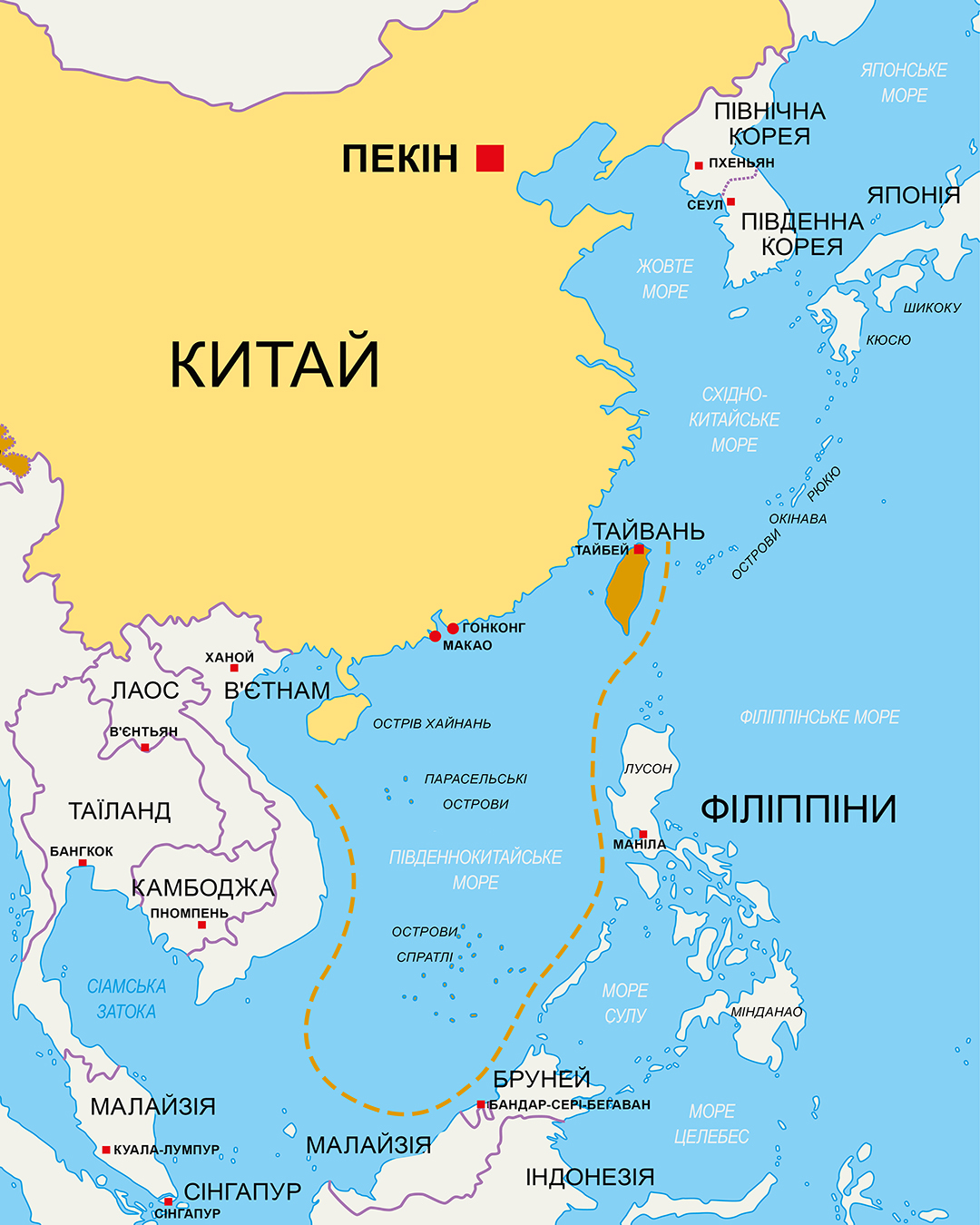 Пунктирна лінія, також відома як лінія дев'яти пунктирів, позначає територіальні претензії Китаю в Південно-Китайському морі
