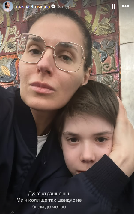 Українська телеведуча та журналістка в Insagram Маша Єфросініна виклала фотографію разом з сином та розповіла, що під час атаки було дуже страшно. Вона зазначила, що ніколи ще так швидко не бігли до метро.