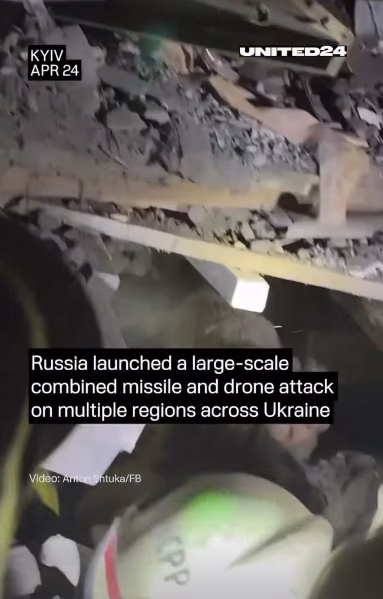 В ніч на 24 квітня Росія здійснила масовану атаку на Україну ракетами та "Шахедами". Внаслідок обстрілу загинуло 9 людей, понад 70 поранених, є пожежі та руйнування, а рятувальники продовжують шукати під завалами людей.
