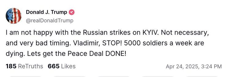 "Володимире, зупинись! 5000 солдатів щотижня гинуть. Укладімо мирну угоду!" — написав Трамп.