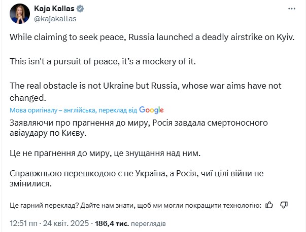 Кая Каллас опублікувала свою реакцію у соцмережі X. Віцепрезидентка Єврокомісії також звернула увагу на суперечність у діях РФ, коли говориться про мир, але продовжують воювати. З її слів, реальна перешкода для миру — це Москва, а не Київ.