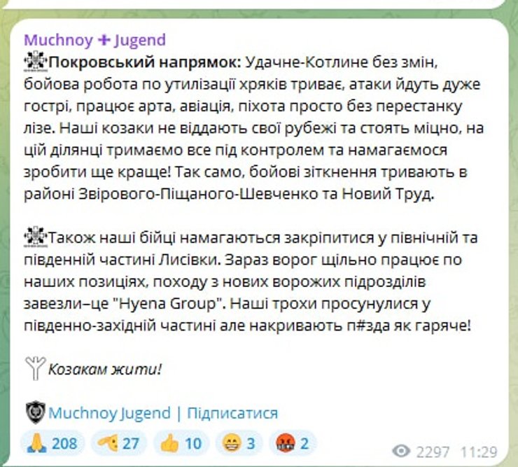 "Наші бійці намагаються закріпитися у північній та південній частині Лисівки. Зараз ворог щільно працює по наших позиціях, походу з нових ворожих підрозділів завезли – це "Hyena Group". Наші трохи просунулися у південно-західній частині", — написав "Мучной".