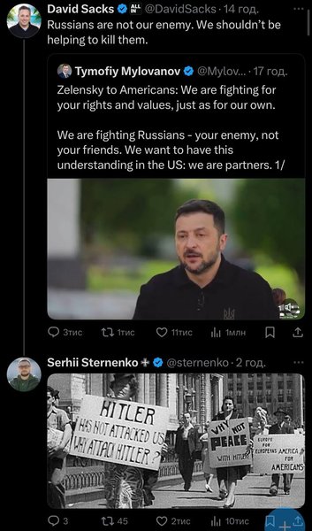 Американський підприємець, автор та інвестор у фірми інтернет-технологій Девід Сакс закликав "не допомагати вбивати росіян". Тим часом ті самі росіяни "готуються" до війни із США.