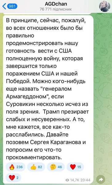 "У принципі, зараз, мабуть, у всіх відносинах було б правильно продемонструвати нашу готовність вести з США повноцінну війну, яка завершиться лише поразкою США та нашою Перемогою. Можна ще когось назвати "генералом Армагеддоном", якщо Суровікін дещо зник з поля зору", — написав Дугін.