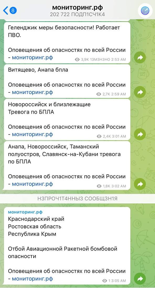 Тривогу у місті Новоросійськ на півдні Росії, у Краснодарському краю, було оголошено близько 03:00 години через загрозу ударних БпЛА.