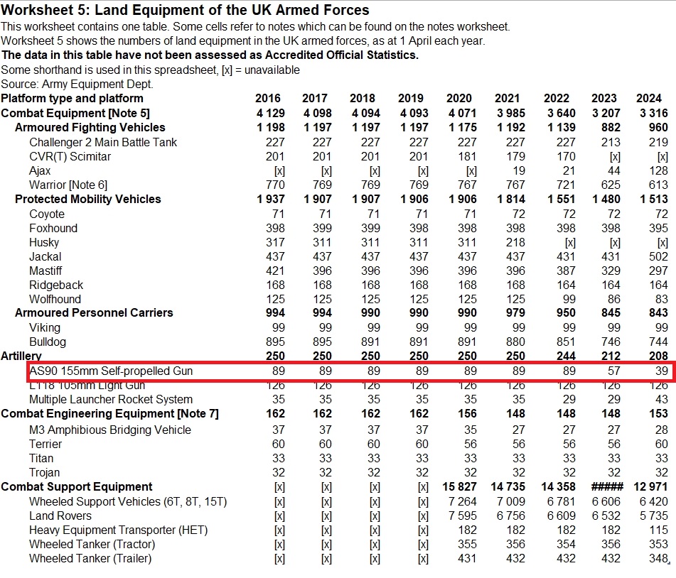 Згідно з даними Міноборони Великої Британії щодо кількості техніки на балансі, у 2023 році систем AS-90 було 57 одиниць. У лютому 2024 року їхня кількість зменшилася до 39 систем, адже інші екземпляри передали Україні.
