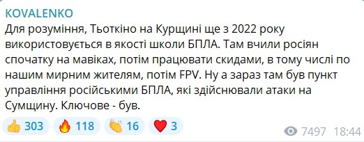Генштаб не уточнив, який літак використали для удару по території РФ та який саме засіб ураження. На карті аналітиків DeepState бачимо, що населений пункт зі схованкою операторів дронів БПЛА розташований впритул до російсько-українського кордону. За 10 км — українські села Ворожба та Білопілля, з яких Сумська ОВА оголосила евакуацію.