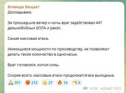 "За минулі вечір та ніч ворог задіяв 447 далекобійних БПЛА та ракет. Наймасовіша атака. Наявні потужності з виробництва не дозволяють робити таку кількість відразу. Ворог готувався, збирав сили. Швидше за все, масові атаки продовжаться усі вихідні", — пишуть у російському телеграм-каналі "Воевода вещает".