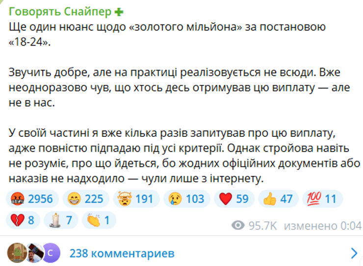 "Уже не раз чув, що хтось десь отримував цю виплату — але не в нас... Чергова зі стройової навіть не розуміє, про що йдеться. Жодних офіційних документів чи наказів не надходило — чули тільки з інтернету", — пояснив ситуацію Бунятов.