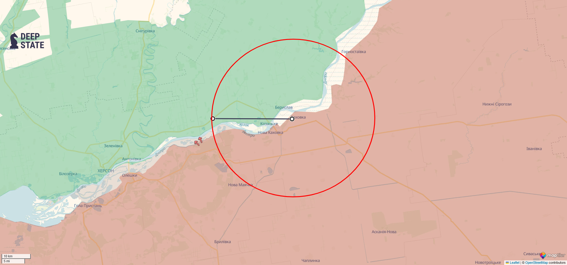 ЗРК "Тор" — комплекс протиповітряної оборони, вартістю близько 24 млн дол. ЗРК призначений для знищення цілей різних типів: дронів — на відстані до 9-15 км, вертольотів — 13-20 км, літаків F-16 — до 27 км. Якщо ЗРК "Тор" ЗС РФ стояв біля Каховки, то він мав захистити позиції росіян у радіусу 27 км. На карті DeepState бачимо, що ця зона охоплює місцевість на правому березі Дніпра, окуповану Нову Каховку, майже дістає до сіл Кринки-Козачі Лагері на південному заході.