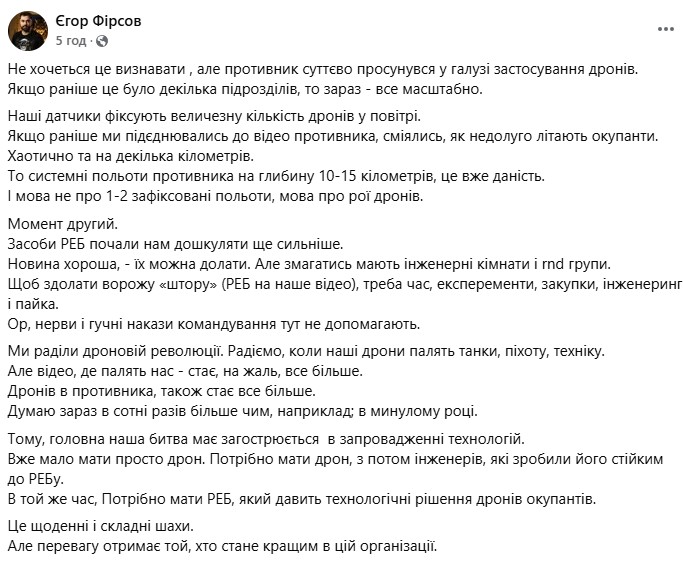 Народний депутат та військовий Єгор Фірсов написав, що Збройні сили Російської Федерації заповнили лінію фронту в Україні безпілотниками, які безупинно загрожують українським бійцям. Ворог заповнив простір роями дронів, а засоби радіоелектронної боротьби засліплюють детектори, якими користуються українці.