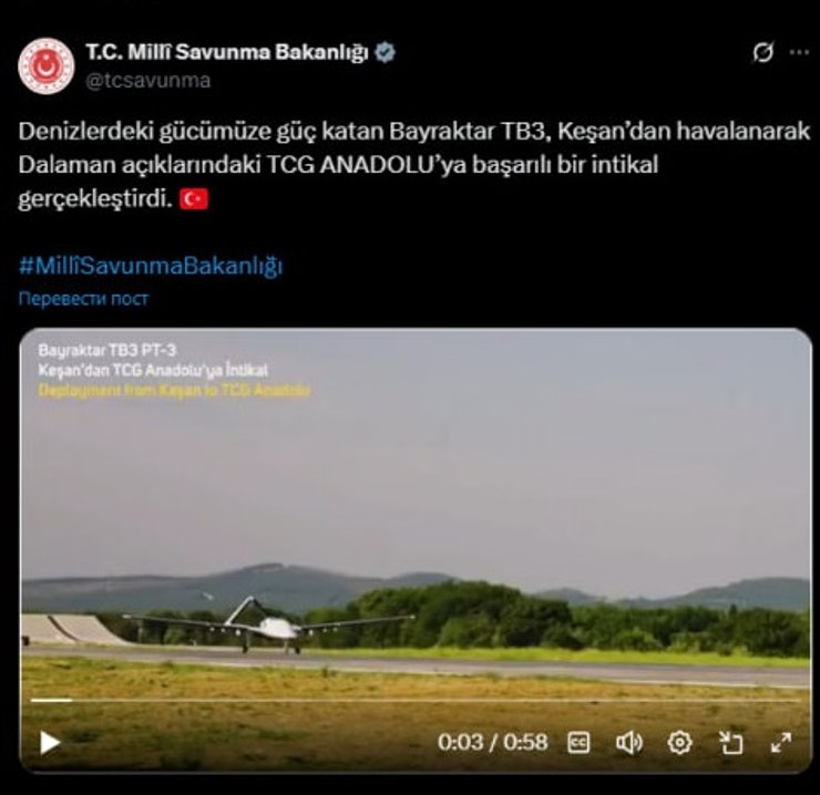 Між тим Міністерство оборони Туреччини днями повідомило про успішне випробування ще однієї версії "Байрактара" — Bayraktar TB3, викавши відео, коли він злетів з Кешана та приземлився на корабель TCG Anadolu біля узбережжя Даламана.