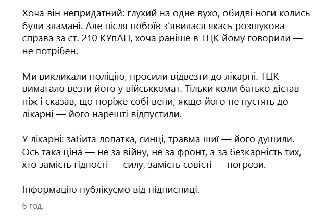 "Ми викликали поліцію, просили відвезти до лікарні. ТЦК вимагало везти його у військкомат. Тільки коли батько дістав ніж і сказав, що поріже собі вени, якщо його не пустять до лікарні — його нарешті відпустили. У лікарні: забита лопатка, синці, травма шиї — його душили", — розповіла користувачка.