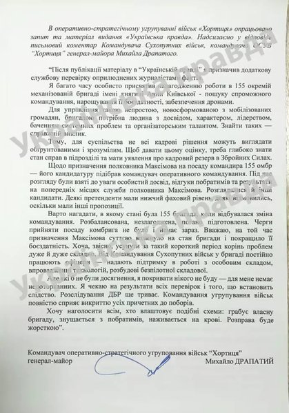Командувач Сухопутних військ ЗСУ, генерал-майор Михайло Драпатий ініціював додаткову службову перевірку в 155-й окремій механізованій бригаді після розслідування "Української правди" щодо бізнесу на "бойових" виплатах.