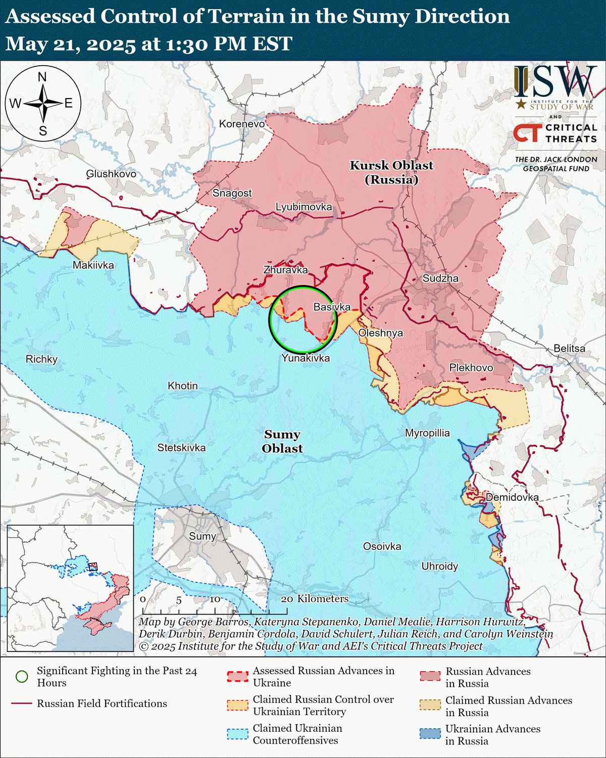 У звіті аналітиків, який з'явився 21 травня, озвучили причину візиту Путіна в Курську область. 20 травня очільник Кремля вислухав прохання двох регіональних топчиновників, які просили створити "буферну зону" для захисту російського населення. У відповідь президент РФ погодився, що це дійсно варто зробити. ISW назвав дві причини такого рішення. Перша причина — Путін хотів показати себе "ефективним та залученим лідером воєнного часу". Друга — просування до Сум стане аргументом для можливих майбутніх перемовин: росіяни заявлять, що претендують на ще одну українську область.