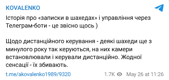 Російські оператори безпілотних літальних апаратів типу Shahed використовують боти в соціальній мережі Telegram, щоб отримувати дані про політ у режимі реального часу. Новий алгоритм керування БПЛА ЗС РФ описав російський інженер у записці, яку знайшли в "Шахеді" після чергової ворожої атаки.
