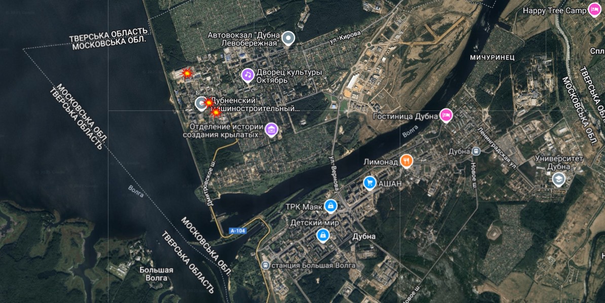 Тим часом у каналі Exilenova+ навели геолокацію кадрів влучання по підприємствах у Зеленограді та Дубні. З'ясувалось, що на території Дубнянського зводу зафіксували три влучання (56.75897, 37.11347; 56.754, 37.11999; 56.75247, 37.1222), а у Зеленограді — два (55.98162, 37.21585; приблизно 55.9836, 37.2197). Також стверджується, що у Дубні вдалось пошкодити новий завод АО "Кронштадт", який займається випуском "великогабаритних дронів палубного та вертолітного базування" і запущений у 2021 році (на карті — вгорі зліва).