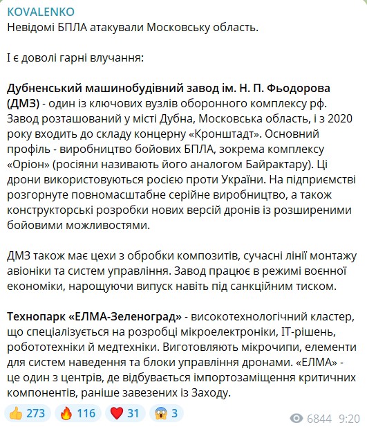 Друга уражена ціль — технопарк "ЕЛМА-Зеленоград". Технопарк займається виробництвом мікроелектроніки та робототехнікою. Зокрема, виготовляють систему наведення та управління дронами, написав Коваленко. Глава ЦПД також зауважив, що підприємство допомагає РФ обходити санкції на постачання радіоелементів.