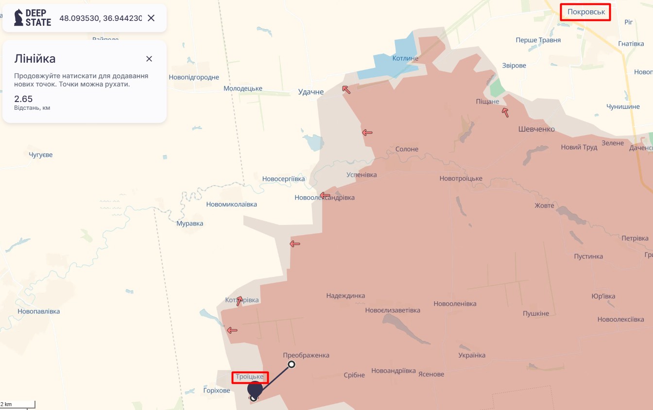 По інший бік від Покровська аналітики зафіксували наступ ЗС РФ біля села Троїцьке. Зміни на карті показали, що росіяни рвонули ледь не на 3 км у бік адміністративної межі Дніпропетровської області.