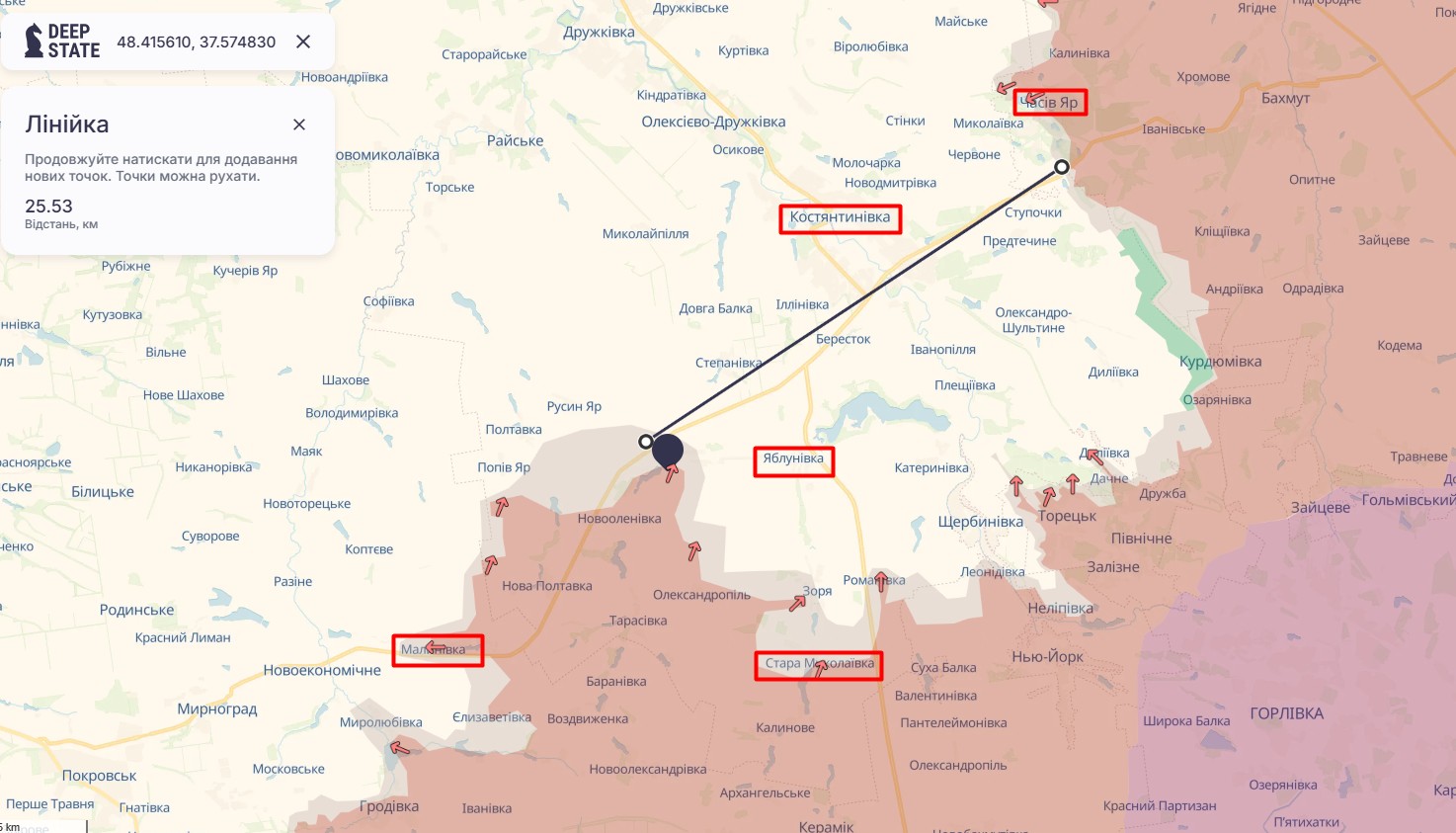 Покровський напрямок. Костянтинівка. Згідно з даними DeepState ЗС РФ мають успіхи біля трьох сіл. Біля Малинівки лінія боїв змістилась на 800 м, свідчить карта. Біля Старого Миколаєва ворог прорвався на глибину 1,8 км на ділянці шириною близько 4 км. Біля Яблунівки — ще "плюс" 1,3 км на користь росіян. Карта показує, що ЗС РФ намагаються рухатись по трасі Т-0504: з одного боку — за 10 км Костянтинівка, з іншого — за 10 км Мирноград, а за ним Покровськ.