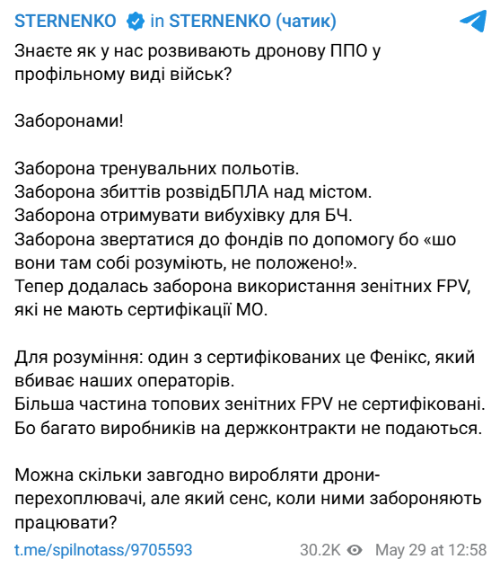 Стерненко перелічив заборони на тренувальні польоти, збиття ворожих розвідувальних БПЛА над містами, отримання вибухівки для бойової частини та звернення по допомогу до фондів допомоги ЗСУ і зазначив, що тепер до них додалася заборона на використання зенітних FPV-дронів без сертифікації Міноборони.