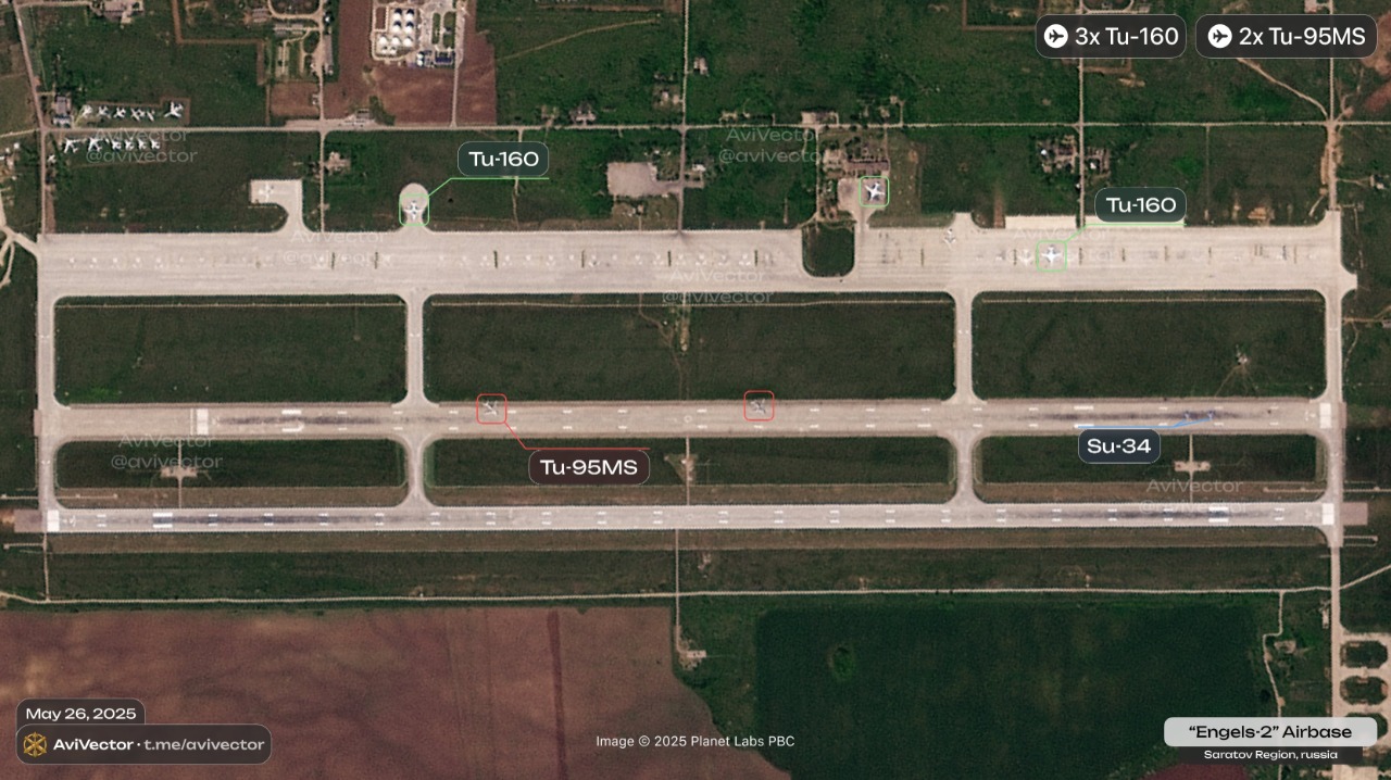 Згідно з даними, станом на 25 травня на авіабазі "Енгельс" перебували шість бомбардувальників Ту-95МС, три надзвукові Ту-160 і чотири фронтові Су-34. Уже наступного дня, 26 травня, кількість літаків зменшилася вдвічі: по три Ту-95МС і Ту-160, а також лише два Су-34.