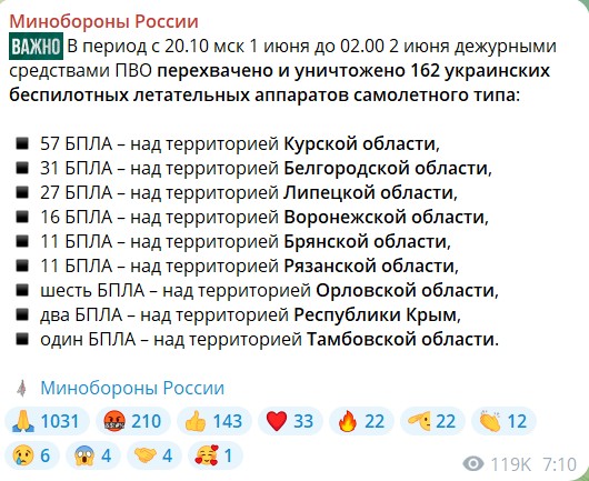 Тим часом Міноборони РФ відзвітувало про підсумки атаки дронів в ніч на 2 червня. Російське командування доповіло, що помітило 162 БпЛА. Три регіони-лідери за кількістю збитих дронів — це Курська, Бєлгородська, Липецька області.