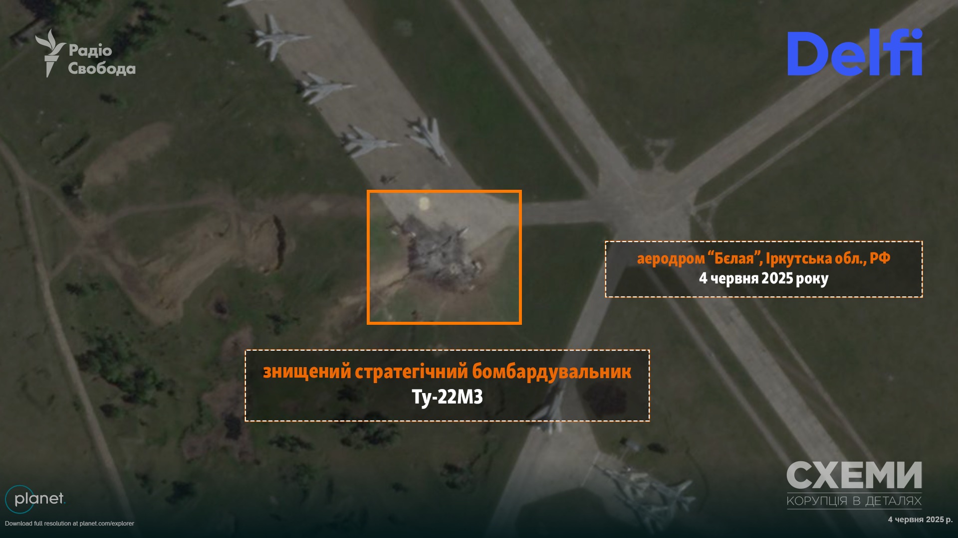 Зазначається, що знімки Planet Labs від 4 червня фіксують знищення щонайменше семи літаків на аеродромі "Белая" в Іркутській області. Серед них — три Ту-95 і чотири Ту-22М3. Тим часом OSINT-канал "Око Гора", порівнявши знімки за 2 і 4 червня, дійшов висновку, що один із пошкоджених Ту-95, імовірно, терміново очистили або замінили, щоб створити ілюзію неушкодженого літака.