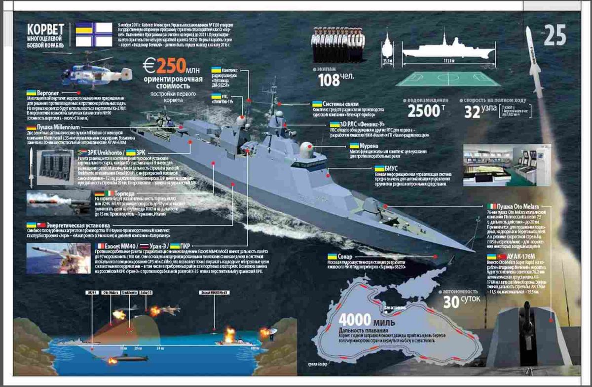 Окремо зазначимо спроби України відновити будівництво високотехнологічних бойових кораблів. Наприклад, проєкт 58250 з будівництва корветів замислювався як основа океанського компонента українського флоту. Зокрема, корвет "Володимир Великий", який був закладений 2011 року на Чорноморському суднобудівному заводі в Миколаєві, мав стати цілком сучасною бойовою одиницею. Водотоннажність 2650 тонн, дальність плавання — 4000 миль, автономність — 30 діб. Екіпаж — 108 осіб.