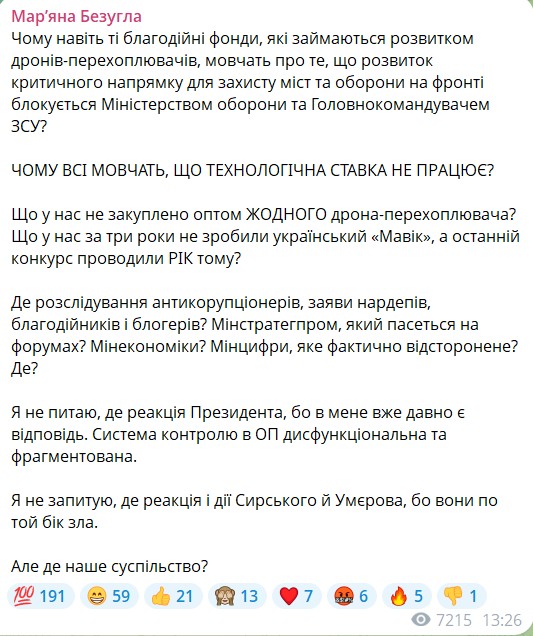 Народна депутатка написала, що в Україні не відбуваються державні закупівлі у "критичному напрямку", від якого залежить захист міст та сіл від російських обстрілів. Згідно з даними Безуглої, Міноборони не замовило жодного дрона-перехоплювача, а Mavic купували рік тому. Ще одне зауваження — українці протягом трьох років не створили свій аналог Mavic. Нардепка назвала дії офісу президента "дисфункціональними та фрагментованими" та звернулась до інших суспільних та державних інституцій, які повинні були б займатись питанням закупівель, але чомусь мовчать.