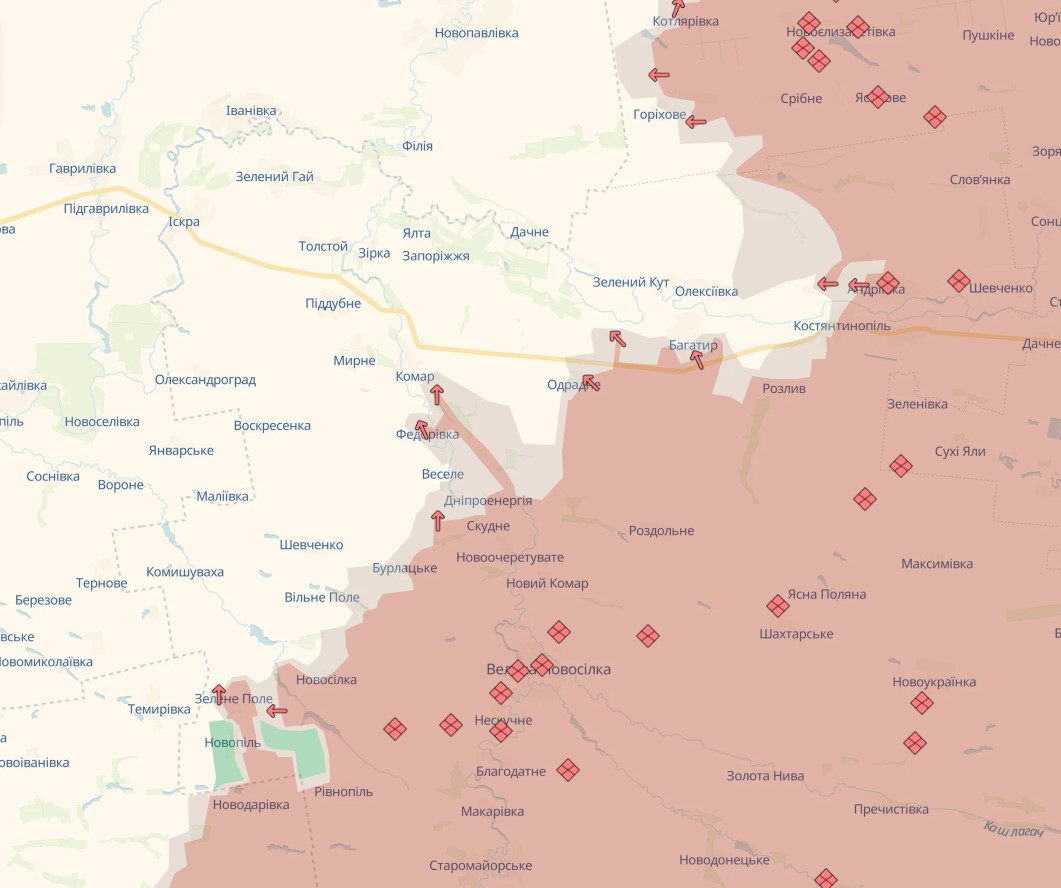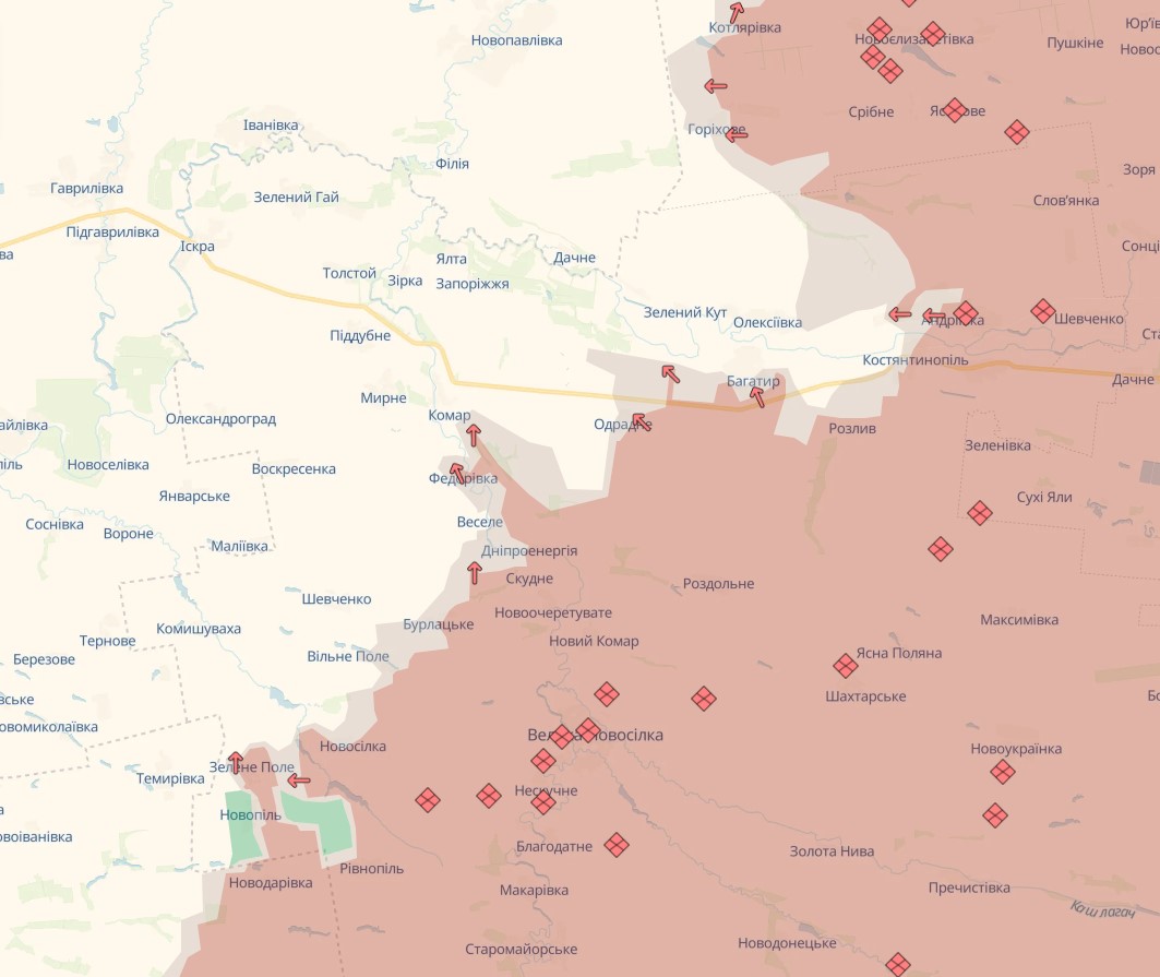 Війська РФ також просунулися в бік адміністративного кордону Дніпропетровської області, а саме з боку села Богданівка на південь від Троїцького. Таким чином утворюється кишеня в районі Костянтинополя та Олексіївки на південний захід від Покровська. Цьому сприяє і просування противника в районі Дніпроенергії.