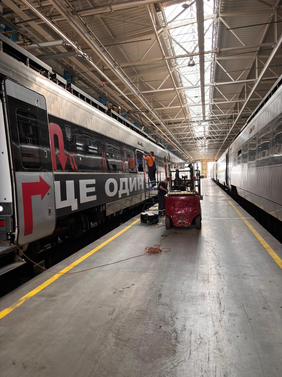 Борти пошкодженого поїзда "Інтерсіті" розмалювала відома американська художниця Барбара Крюгер. Її робота "Без назви (Ще одне знову)" присвячена українцям, які попри все щодня без зупину продовжують рухатися вперед, розповіли в "Укрзалізниці".