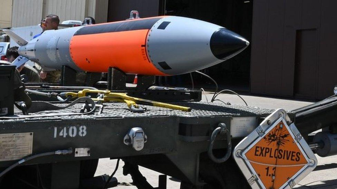 Ймовірно, в цьому випадку йдеться про кориговану протибункерну авіаційну бомбу GBU-57A/B Massive Ordnance Penetrator (MOP), що корегується, які є одним з найпотужніших неядерних боєприпасів в арсеналі ВПС США.